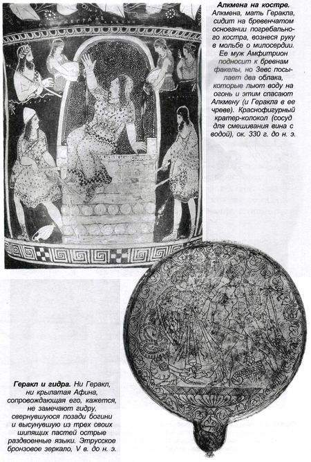 Геракл, один из великих греческих героев, рожден Зевсом и Алкменой. Алкмена была добродетельной женой Амфитриона. Зевс обманул ее: принял облик Амфитриона в тот момент, когда тот отсутствовал дома, и овладел ею. Когда муж возвратился и узнал о случившемся, он настолько разгневался, что решил заживо сжечь Алкмену. Ее спасло вмешательство Зевса: владыка Олимпа наслал дождь, который загасил костер, разожженный Амфитрионом, и вынудил его смириться с произошедшим. Будучи еще младенцем, Геракл быстро доказал свое божественное происхождение и героический нрав. Однажды ночью он лежал в колыбели, завернутый в пеленки, рядом со своим родным братом Ификлом. Ревнивая жена Зевса Гера решила избавиться от мальчика и натравила на него двух змей. Когда змеи обвили тела младенцев, Ификл лишь заплакал, Геракл же схватил их за горло и тотчас задушил. Другое подтверждение божественности Геракла – его юношеский подвиг, когда он победил грозного льва на горе Киферон. Подвиги взрослого Геракла были гораздо более известными и значительными, чем деяния других героев, поэтому в давние времена он был чрезвычайно популярен, являясь персонажем множества историй и бесчисленных произведений искусства. Хотя наиболее последовательно его имя начинает упоминаться в литературных источниках только с III столетия до н. э., по отдельным данным и свидетельствам из художественных источников можно заключить, что об этом герое хорошо знали и в более древние времена.