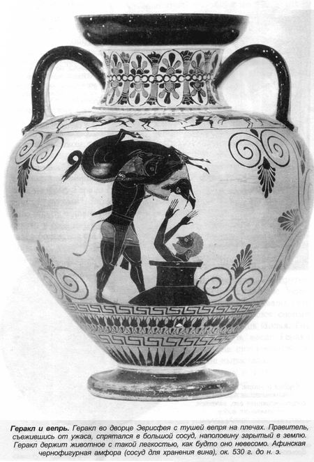 На горе Эриманф обитал свирепый дикий вепрь, который опустошал окрестные земли. Геракл долго преследовал его и поймал живым, потому что именно такое задание он получил от Эврисфея. На древних рисунках этот эпизод обычно изображается следующим образом: Геракл с живым вепрем на спине и Эврисфей, забравшийся от страха в большой сосуд.