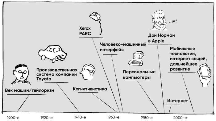 Рис. 1.5. UX имеет долгую, овеянную легендами историю, пересекающуюся с другими разработками в области бизнеса, дизайна и технологий, с которыми ваши коллеги, возможно, знакомы