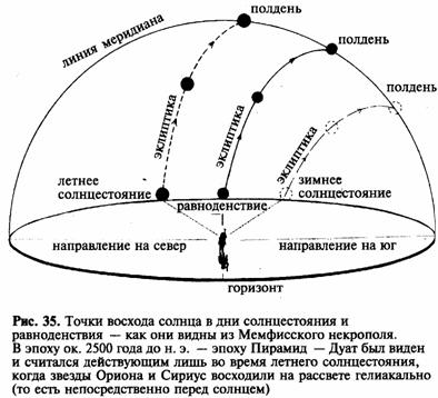 Звезды восходят вместе с СолнцемОписание Хассаном небесного ландшафта Дуата верно лишь в том смысле, что, как он отмечает, все наблюдается на востоке, само наблюдение происходит в момент перед рассвотом (по его терминологии, «ложный рассвет»), а созвездие Ориона (Осириса), звезда Сириус (Исида), Солнце (Ра) и ряд других космических объектов, представляющих Атума (отца богов), все находятся в Дуате. Однако поскольку он не силен в основах небесной механики и не рассматривает соответствующие строки из «Текстов Пирамид» в контексте времени и места, то допускает те же серьезные ошибки, которые впоследствии усугубились другими многочисленными учеными, которые были неграмотными в вопросах астрономии: