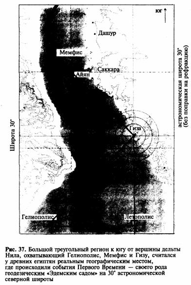 Золотой век и пришествие злаВ дальнейшем мы еще вернемся к Первому Времени богов, чтобы подробнее его рассмотреть. Сейчас же достаточно отметить, что Зеп Тепи считался таинственным и чудесным Золотым веком, который следовал непосредственно за Творением. Причем, по разумению древних египтян, Золотой век был не «Бог знает где», как библейский Сад Эдема, а в знакомом реальном физически и исторически месте. Они были убеждены, что события Первого Времени происходили не где-нибудь, а немного южнее вершины дельты Нила, конкретно – в треугольнике, образованном Гелиополисом, Мемфисом и Гизой. Именно здесь, среди священного ландшафта, бога Первого Времени, как сказано в текстах, основали свое земное царство[70].
