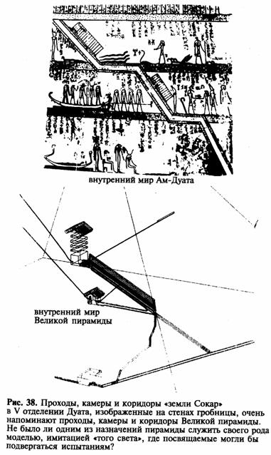 Далее. Как мы отмечали мимоходом в части I, проходы, камеры и коридоры земли Сокара, как они изображены на стенах гробницы в составе Пятого раздела Дуата, явно напоминают проходы, камеры и коридоры Великой пирамиды в Гизе. При этом сходство настолько близко, что даже возникает вопрос: может быть, одна из функций пирамиды – служить моделью или «имитацией» того света, где посвященные проходят обучение и экзамены на интеллектуальную и духовную подготовленность к ужасным испытаниям, которым душе предстоит подвергнуться после смерти?
