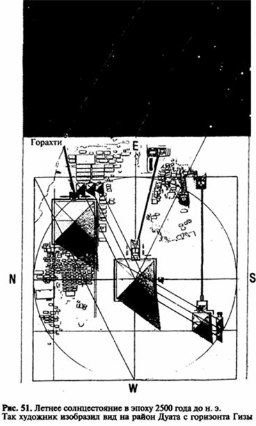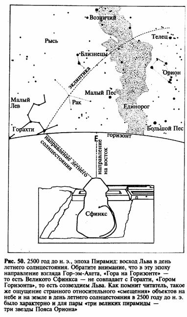 Но почему небесная картина находится «не на том месте» восточного горизонта? Или, пользуясь терминологией пресловутого дуализма, почему Гор-эм-Ахет, Гор на Горизонте, то есть Великий Сфинкс, не нацелен на Горахти, Гора Горизонта, то есть созвездие Льва? И почему эстакада Сфинкса не нацелена на восходящее солнце, дабы связать царя-Гора с его космическим солнечным собратом?