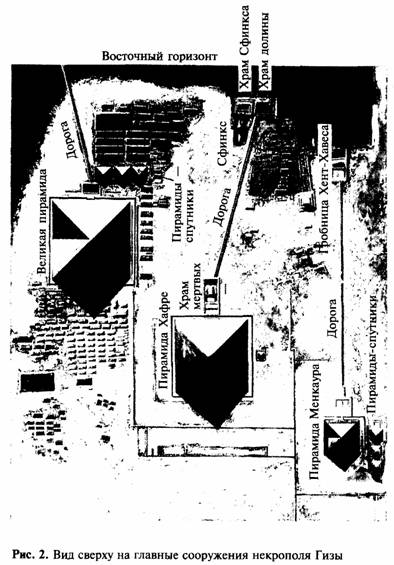 Например, три великие пирамиды обычно считают гробницами Хуфу, Хафры и Менкаура – трех фараонов IV династии. Тем не менее ни в одном из этих памятников не обнаружено тел фараонов, и, хотя в полостях под потолком камеры Царя в Великой пирамиде обнаружены так называемые «пометки каменотесов» – грубо высеченные надписи, – они, как мы увидим в части II, не так уж свидетельствуют в пользу ортодоксальной атрибуции пирамиды Хуфу. В Великой пирамиде, а также и в тех, что приписывают Хафре и Менкауру, больше нет никаких надписей. Надписи отсутствуют также в трех маленьких пирамидах-спутниках, которые выстроились в ряд с восточной стороны от Великой пирамиды, а также еще в трех спутниках, расположенных вблизи юго-западного края площадки. В этих шести пирамидках найден ряд предметов времен IV династии, но нет гарантии, что они являются современниками самих монументов.