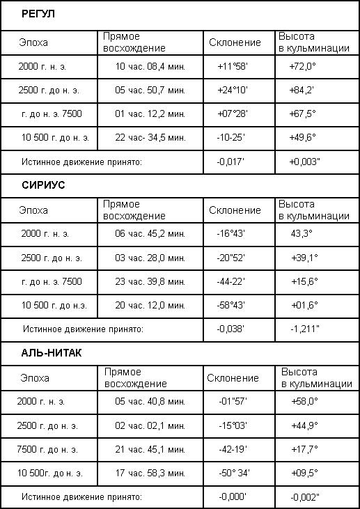 Используя перечисленные выше поправки, на компьютере Эпл-Макинтош по программе Скаит-Чарт-2000 были рассчитаны для разных дат положения звезд Регул, Сириус и Аль-Нитак, находящихся соответственно в созвездиях Льва, Большого Пса и Ориона: