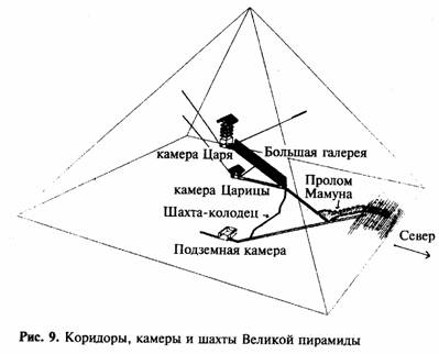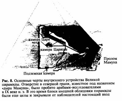 Что касается внутреннего устройства Великой пирамиды, то оно намного сложнее; в ней имеется целый ряд проходов и галерей, которые то поднимаются, то опускаются (точнее под углом 26°), и три главных внутренних камеры. Из последних лишь одна – подземная камера – находится ниже уровня грунта. Две других – так называемые камера Царицы и камера Царя – расположены в самой толще сооружения, причем довольно высоко над землей.