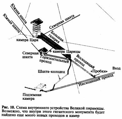Надо сказать, что в Великой пирамиде есть достаточно места как для такой второй системы проходов, так и для многого другого. Подсчитано, что в пределах внутреннего пространства пирамиды, объем которого достигает 240 тысяч кубометров, могло бы разместиться до 3700 камер, размером с камеру Царя.
