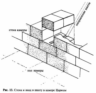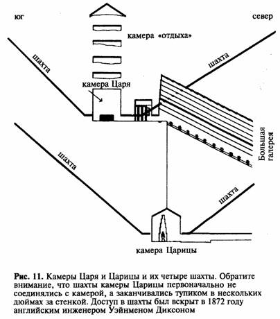 И совсем пропадают все сомнения, если рассмотреть внимательнее шахты камеры Царицы. В отличие от шахт камеры Царя, эти а) не имеют выхода на поверхность монумента и б) первоначально не сообщались с внутренней полостью камеры Царицы. Вместо этого строители оставили последние 12 сантиметров известнякового блока, облицовывающего палату, в целости и сохранности, так что шахты остались невидимыми для того, кто попадал в помещение. Эти сантиметры были пробиты стальным долотом английского инженера Уэйнмена Диксона, «вольного каменщика», любопытство которого было возбуждено шахтами камеры Царя, после чего в 1872 году он решил поискать что-нибудь подобное в камере Царицы.