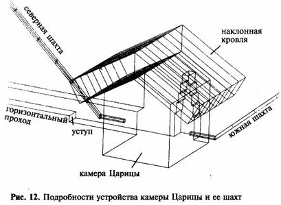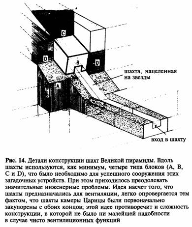 «Из камеры Царицы северная шахта выходит под углом 39° и была направлена на звезду Кочаб (Бета созвездия Малой Медведицы), которую древние связывали с „космическим возрождением“ и бессмертием души. Южная же шахта, наклоненная на 39°3(У, быланацелена на яркий Сириус (Альфа Большого Пса). Эту звезду древние связывали с богиней Исидой, космической матерью царей Египта». Из камеры Царя северная шахта (угол 32°28') была нацелена на Полярную звезду древности, Тубан (Альфа Дракона), которую фараоны связывали с понятиями «космического зачатия и беременности». Южная шахта (угол 45°14') была нацелена на Аль-Низак (Зета Ориона), самую яркую и низко расположенную из трех звезд Пояса Ориона, которая у древних египтян ассоциировалась с Осирисом, их великим богом воскрешения и возрождения, принесшим, согласно легенде, цивилизацию в долину Нила в далекую эпоху, называвшуюся ЗепTenu– Первое Время («Тайна Ориона»).