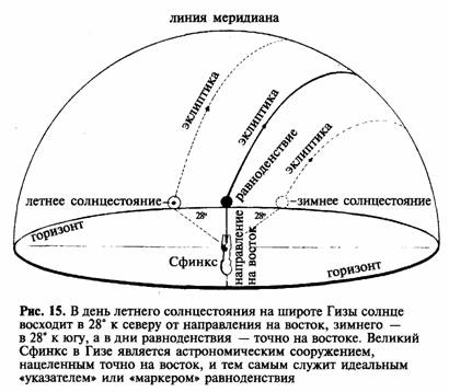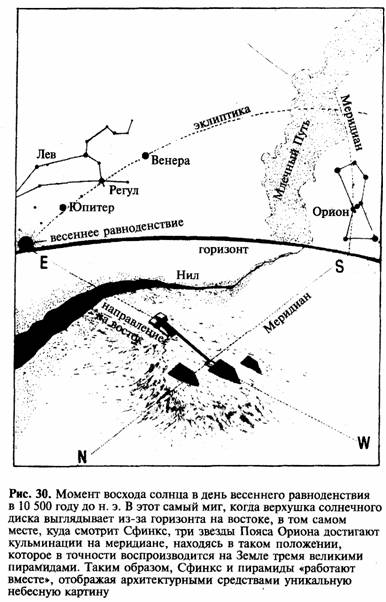 Как отмечалось в «Следах Богов», аналогичную роль играет и Великий Сфинкс, который смотрит на точку восхода Солнца в день равноденствия ,– в любую эпоху, в прошлом, настоящем и будущем, вообще всегда.