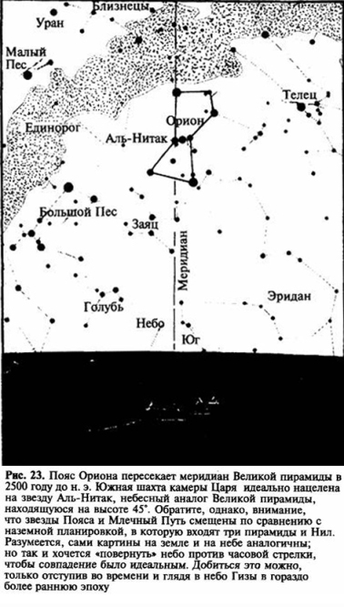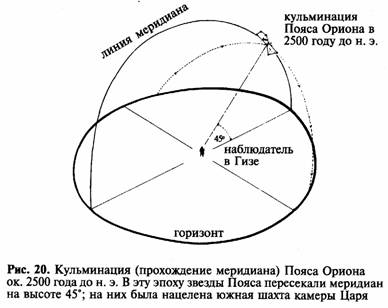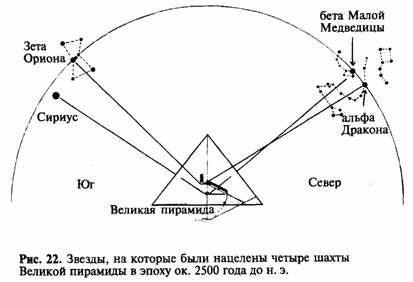 У Великой пирамиды имеется много особенностей, позволяющих без всякого сомнения считать, что ее авторы уделяли большое внимание звездам и следили за их прохождением через меридиан. Например, отверстие настоящего входа направлено на меридиан с точностью прицеливания артиллерийского орудия. Все внутренние коридоры также идеально направлены вдоль меридиана, что делает все сооружение, как отмечали многие астрономы, очевидным «меридиональным прибором». Но наиболее убедительным аргументом является точность четырех шахт. Последние исследования установили как несомненный факт, что около 2500 года до н. э. (в эпоху, которую египтологи считают веком Пирамид) каждая из этих шахт была нацелена на определенную звезду в момент ее кульминации.