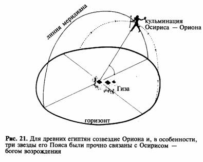 Перед лицом такой симметрии, где довольно сложным образом взаимосвязаны архитектурные и религиозные идеи, трудно удержаться от вывода, что пирамиды Гизы представляют успешную попытку отобразить Пояс Ориона на Земле, особенно если вспомнить, что созвездие Ориона ассоциировалось с великим богом Осирисом.