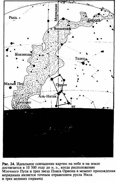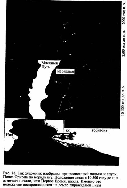 Соответствующее средство в нашем распоряжении имеется, поскольку мы знаем, как ведет себя во времени гигантский волчок Земли. Дадим задание своему компьютеру «прокрутить» перемещение звезд назад, в прошлое. По мере того как он проделывает это, тысячелетие за тысячелетием, мы увидим, что Пояс Ориона в своей кульминации медленно поворачивается против часовой стрелки, сближая два меридиана. Идеальное совпадение – Нил против Млечного Пути, пирамиды против звезд – приходится на 10 500 год до н. э., эпоху за 8000 лет до века Пирамид.