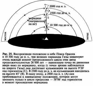 Таким образом, воспроизводя положение звезд пояса в 10 500 году до н. э., пирамиды не только указывают на определенную эпоху, но и довольно точно отмечают начало прецессионного полуцикла.