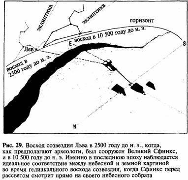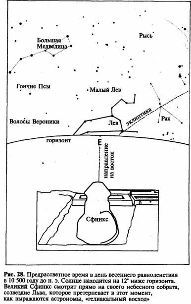3. Для того, чтобы добиться соответствия между земной и небесной символиками, нам придется вернуться в век Льва, который начинался около 10 500 года до н.э. Именно в эту эпоху обращенный лицом к востоку Сфинкс взирал на весенний восход Солнца на фоне созвездия Льва – своего небесного собрата.