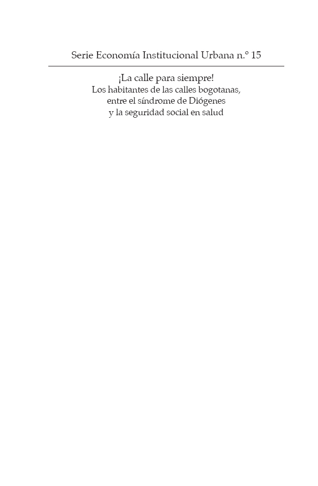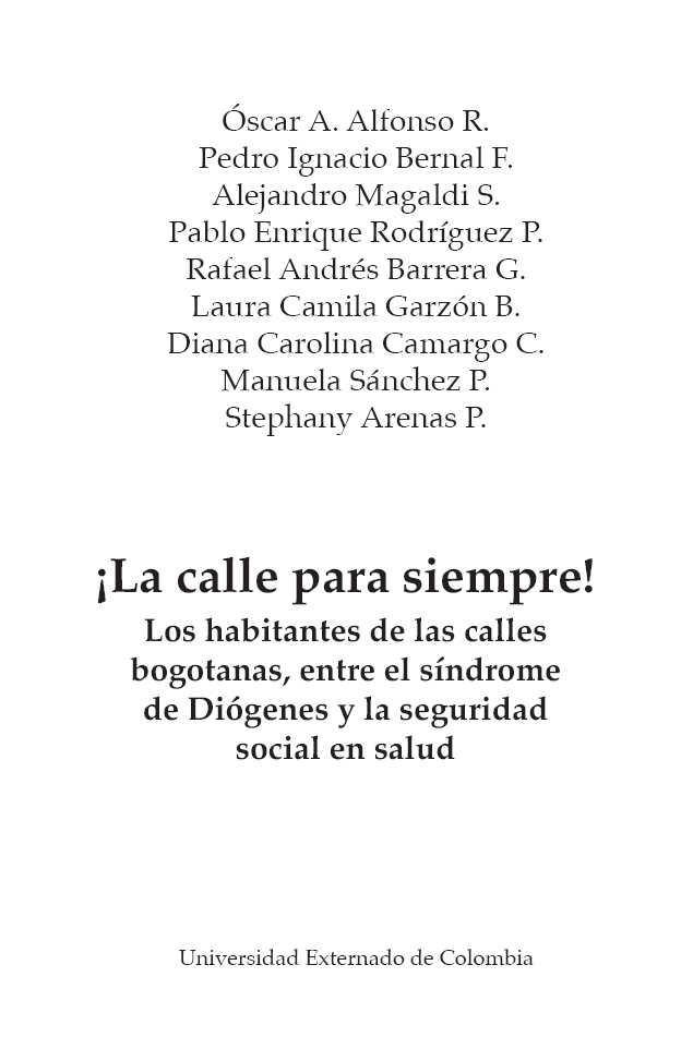 ¡La calle para siempre! : los habitantes de las calles bogotanas, entre el síndrome de Diógenes y la seguridad social en salud / Óscar A. Alfonso R. [y otros]. -- Bogotá : Universidad Externado de Colombia. 2021.