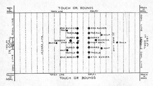 For the purposes of advancing the ball or repelling the attack of the opponents it has proved advisable for a captain to divide his eleven men into two general divisions: the forwards and backs. The forwards, of whom there are seven, are usually called rushers, and they make practically a straight line across the field when the ball is put in play on a "down." Next behind them is the quarter-back, who does the passing of the ball to one or another of the players, while just behind him are the two half-backs and the back, usually in something of a triangle in arrangement, with the last named nearest the goal which his team is defending.