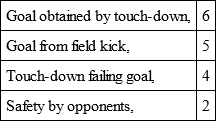 The ball, which is like a large leather egg, is placed in the centre of this field, and each team endeavors to drive it in the direction of the opponents' goal-line, where any scoring must be done. Goals and touch-downs are the only points which count, and these can be made only as follows: