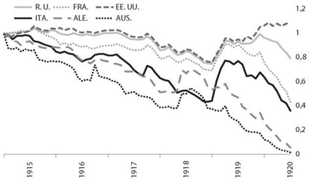 Figura 5. Depreciación de las monedas nacionales frente al franco suizo durante la Primera Guerra Mundial - George Hall, «Exchange Rates and Casualties During the First World War», Journal of Monetary Economics, vol. 51