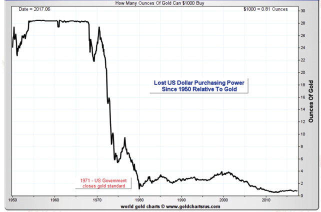 Figura 7. Poder de compra del dólar calculado en oro. Fuente: Goldchartsrus