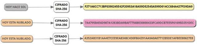 El resultado siempre será una serie alfanumérica de cuarenta cifras. El objetivo del hash no es cifrar o esconder información, sino generar una especie de «huella digital» de un conjunto de datos. Por lo tanto, el objetivo del hash es validar información más que cifrarla. Otro punto interesante es que una función hash es unidireccional: es muy fácil obtener el resultado, pero es imposible saber los datos previos al hash. Por ejemplo, encontrar el hash de las palabras «Buenos días» es sencillo, pero es imposible saber que del hash «21aebc48383652046150c3663a57b1cb5bf957b5ece024deb9cbc087478cdf80» la palabra de origen es «Buenos días». Este concepto es importante porque se utilizará en muchos de los mecanismos de protección del protocolo.
