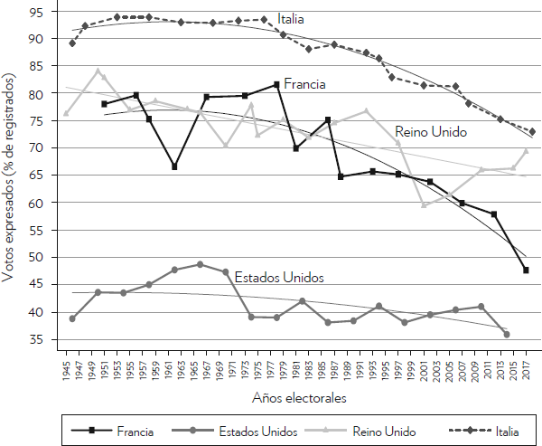 FIGURA 1. ¿El fracaso de la representación?: desplome generalizado de la participación electoral en las elecciones legislativas desde 1945 en Francia, Estados Unidos, el Reino Unido e Italia.