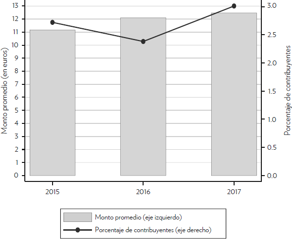 FIGURA 8. “2 por mil”: porcentaje de contribuyentes y monto promedio de la subvención pública en Italia, 2015-2017.