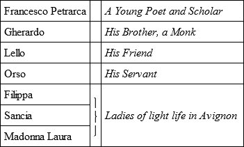 Scene: A room in the chambers of Petrarca at Avignon. It opens on a loggia overlooking, on higher ground, the spired church of Santa Clara and the gray cloisters of a Carthusian monastery. Beyond lie the city walls under glamour of the blue Provençal night.