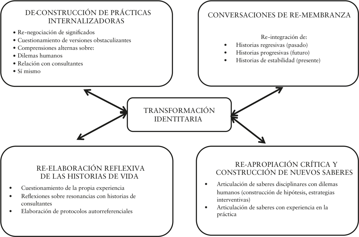 La llegada a las prácticas profesionales no se trata solo de una oportunidad para utilizar los saberes disciplinares aprendidos durante los años anteriores de formación en el trabajo con las personas consultantes. Las prácticas y específicamente el ejercicio de la supervisión constituyen una posibilidad de transformación, en la que los procesos autorreferenciales invitan a asumir con responsabilidad las novedades identitarias.