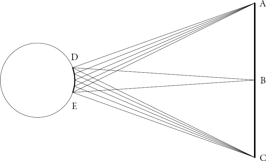 La figura 2.2 permite ilustrar, de manera simplificada, la complejidad del aporte de Alhacén. La circunferencia representa la estructura ocular, de la cual ahora solo interesa resaltar la puerta de entrada DE (pupila). El objeto ABC puede concebirse como un conglomerado de puntos radiantes. A es ahora el vértice de un cono que radia en todas las direcciones a través de un medio transparente (aire). En la figura solo resaltamos la porción del cono que se irradia desde A y que afecta la superficie del ojo que corresponde a la entrada de la pupila, es decir, el cono ADE. Lo propio ocurre con C y con B, quienes configuran los conos CDE y BDE. Esto ha de replicarse para cada uno de los puntos que forma parte de la cara visible del objeto.