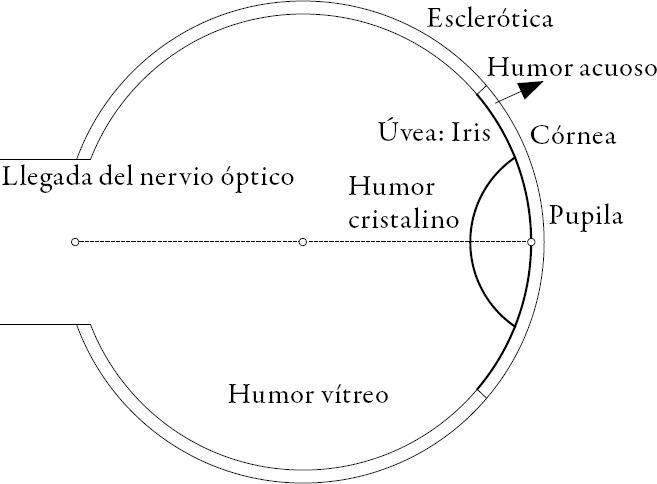 Alhacén asume, entonces, compromisos intramisionistas. Con este presupuesto, el filósofo centra su atención en la estructura del órgano ocular y en la manera como este está al servicio de la recepción de la luz y del color que vienen del exterior.20 No son propiamente los hallazgos anatómicos los que determinan las pautas geométricas de la descripción. El asunto se formula, más bien, al revés: son las demandas geométricas las que determinan las particularidades anatómicas. A manera de ejemplo, Alhacén no razona así: dado que el cristalino tiene esta peculiar forma geométrica, los rayos de luz y color han de tener tal o cual comportamiento geométrico. El esquema de razonamiento sigue, más bien, el siguiente curso: dado que la percepción demanda tal o cual exigencia geométrica, la forma del cristalino ha de ser tal cual y no otra. La estructura anatómica del ojo está descrita en el capítulo 6 del libro I. La figura 2.1 muestra, en forma muy simplificada, los elementos más importantes.