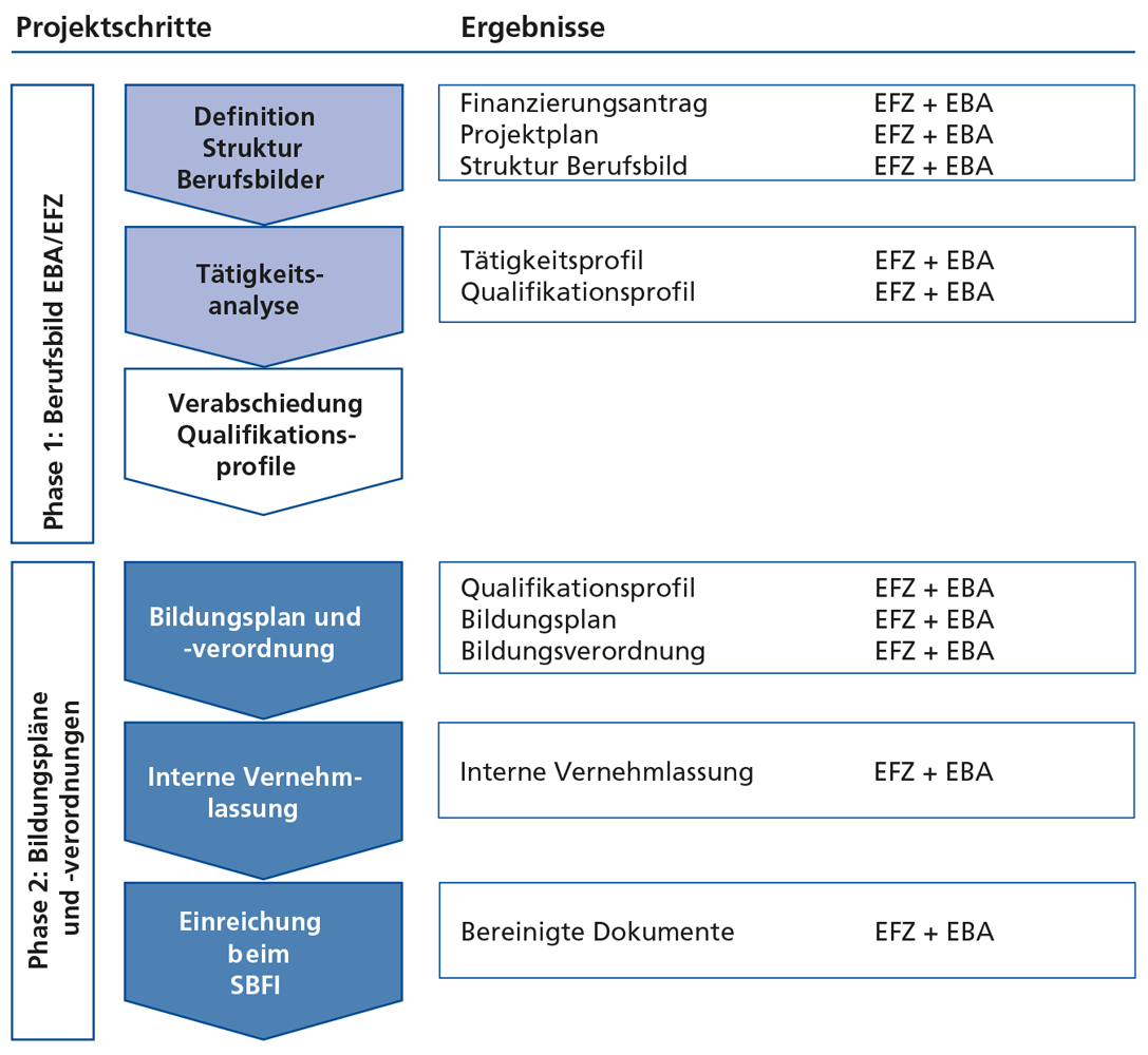 In Phase 2 werden die Bildungsverordnung und der Bildungsplan gemeinsam mit der Reformkommission entwickelt. Den Abschluss der Arbeiten bildet die Ausarbeitung eines Informations- und Ausbildungskonzepts für die Berufsbildungsverantwortlichen.