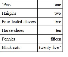 Then they all went out to supper. And such a supper as it was! The table was decorated with green four-leafed clovers, and gilt horseshoes, and black cats, and yellow new moons. And every one had a little rabbit's foot, mounted like a charm, for a souvenir; and also a bright lucky penny of that very year.