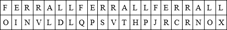 he pursued his course by finding F in his top alphabet line. Running downward until he struck O, he noted that was in the cross line beginning with J. J, therefore was the first letter of the message. Next he found E at the top, and traced that line down to I, which gave him E for his second letter. Going on thus, he soon had the full message, which read:
