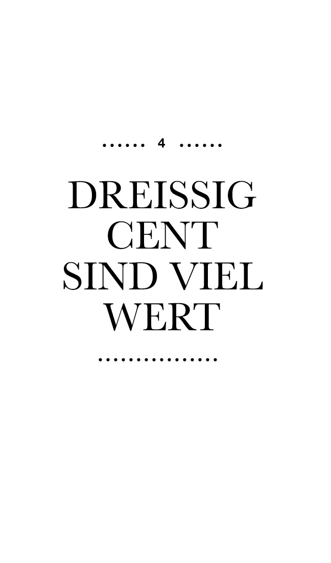 Was kann man heutzutage noch mit dreißig Cent machen? Nicht viel, oder? Eine Kugel Eis bekommt man für diesen Preis schon lange nicht mehr. Ein Brötchen? Vielleicht. Wer an einer Autobahnraststätte auf die Toilette möchte, sollte auch mehr als dreißig Cent dabei haben.