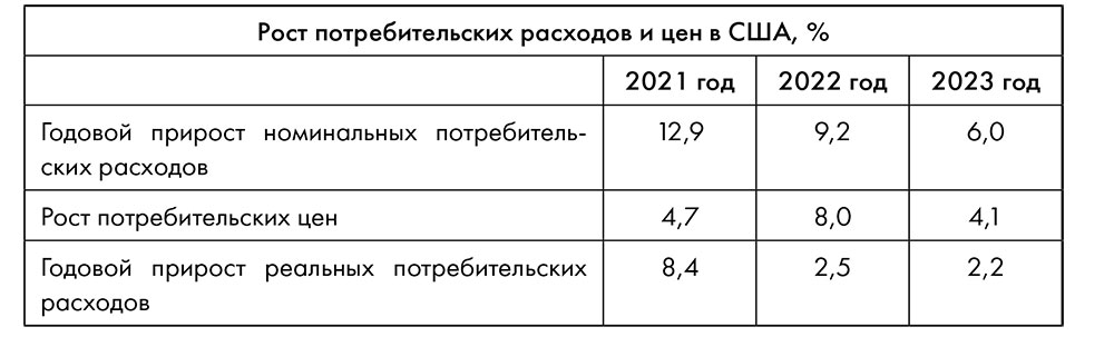 Однако в 2022 году картина оказалась уже совсем иной: рост реального потребления резко замедлился, потому что его стала блокировать инфляция. Разница в темпах роста номинальных потребительских расходов и потребительских цен стала совсем маленькой. А в августе 2023-го прирост номинальных потребительских расходов, по сравнению с предыдущим годом, оказался даже ниже роста потребительских цен. По данным Бюро экономического анализа американского правительства, в первые восемь месяцев 2023 года рост этих расходов на годовом уровне колебался около 2 %.