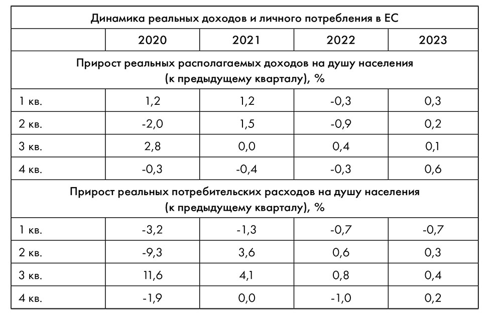 В Евросоюзе (таблица 2) поквартальное снижение реальных располагаемых доходов населения наблюдалось дважды в 2020 году и стало фактически непрерывным с третьего квартала 2021-го до конца 2022 года. Для сравнения, с 2013 по 2019 год падения не было ни разу. Что касается реальных потребительских расходов на душу населения, они бодро росли во Ⅱ и Ⅲ кварталах 2021 года, но в дальнейшем их рост замедлился, а в конце 2022 – начале 2023 года произошло снижение. Со Ⅱ квартала 2013 года до конца 2019-го поквартальных снижений не было.