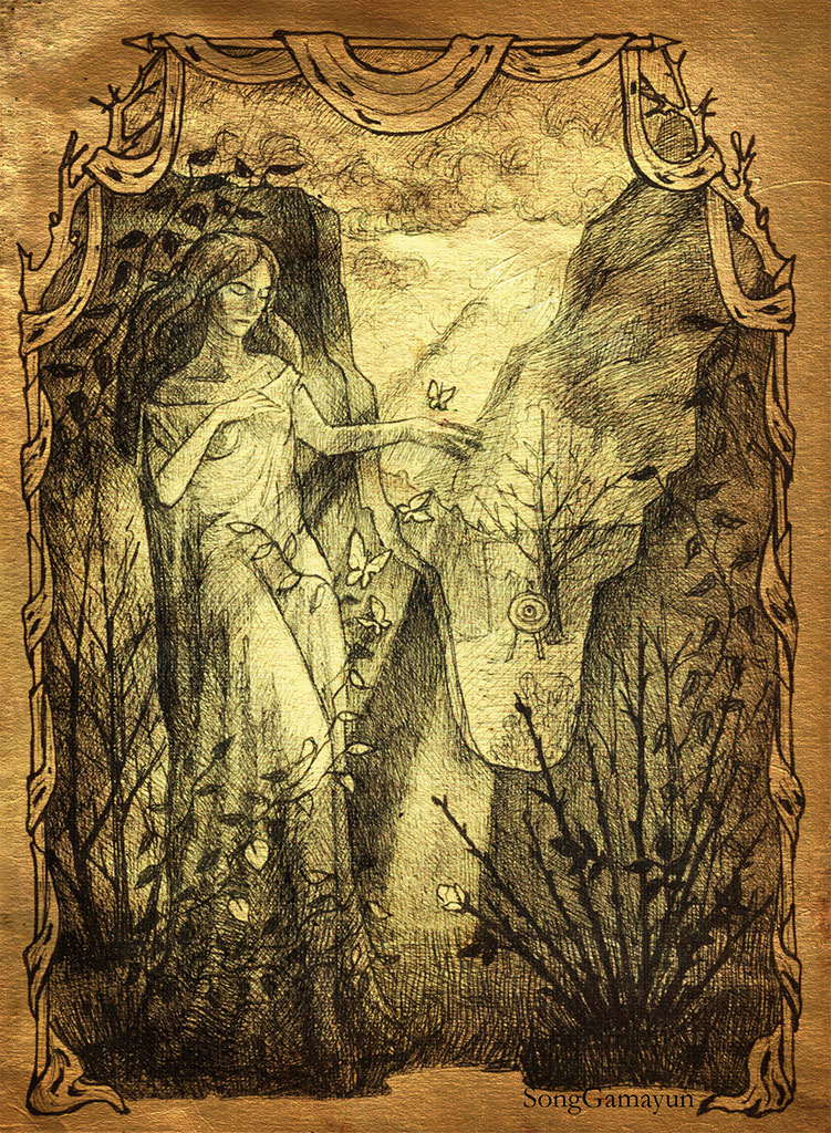 За три года, что Сирел служил на юге, куст белых роз разросся, ощетинившись острыми колючками, и уже давно не цвёл. Качели, что раньше весело покачивались под веткой крепкого дуба, ныне лежали в грязи, под слоем прелой листвой. В углу сиротливо стояла мраморная статуя Дриады, хранительницы природы. Мать Сирела больше других стихий почитала Землю и Воду, передав сыну настороженное отношение к Огню. Дриада охраняла её покой, защищала её сад, но саму её не сберегла.