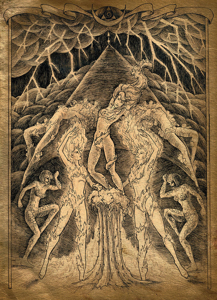 К напряжённой мелодии колёсных лир прибавился тревожный гул барабанов и труб. Сверху, с декоративных скал, на танцовщиц устремила свой взгляд новая жрица. На её голове не было волос, вместо них по коже танцевало яркое пламя, не причиняющее вреда носительнице. Танец, её и присоединившихся к ней жриц, был быстр и порывист. Они окружили Нейлину, подхватили на руки и подняли на скалы.