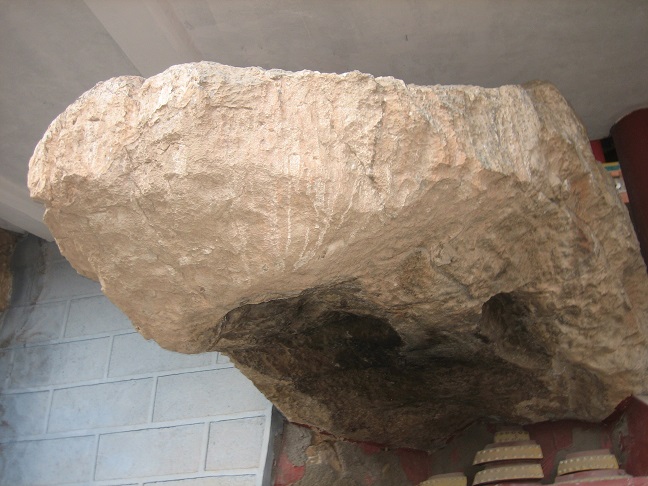 Перед храмом было помещение с огромным камнем, который странно нависал над поверхностью и при ударе деревянной колотушкой издавал звук, похожий на гул. «Любимый камень Далай-ламы, ― сказали мне. ― Он ударял по нему во время медитации».