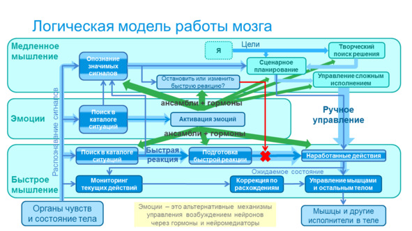Элементной базой, на которой построена наша модель мира, включая модель самого себя, являются ансамбли нейронов. А мышление – это передача возбуждения в этих ансамблях, которое позволяет принимать решения в конкретной ситуации. А также достраивать, оптимизировать и перестраивать свою модель: быстро выполнять типовые действия, ставшие привычными, создавать новые и нетривиальные, и тренировать их, если они оказались эффективными. И все одновременно. Организация ансамблей реализует схемы внимания, ориентированные на определенные ситуации и типы задач, а фокусировка мышления обеспечивается динамиками внимания – переключением этих схем. Теория ансамблей нейронов развита Майклом Грациано в Attention schema theory.