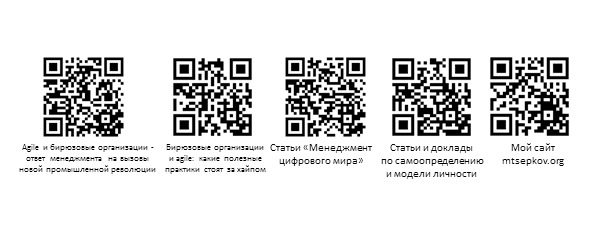 И с 2017 года я, продолжая работать над ИТ-проектами, стал консультантом по применению Agile-методов и других методов самоуправления – бирюзовыми организациям, холакратии, социократией за пределами ИТ, навигатором по миру нового менеджмента цифрового мира. А также рассказываю ИТ-шникам и консультирую ИТ-компании по альтернативным моделям самоуправления, спиральной динамике и другим моделям soft skill, необходимым в современном менеджменте. Опыт работы аналитика позволяет объяснять это на понятном языке, приземлять на знакомый материал. Подробнее – на моем сайте http://mtsepkov.org, там более 230 моих статей и выступлений1 по разным темам и много других материалов.