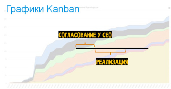 В Kanban тоже есть несколько хороших визуальных представлений. Одно из них – кумулятивная диаграмма потока, на которой каждый день по вертикали откладывают число задач, находящихся на каждой стадии, как показано на рисунке. В результате по горизонтали мы можем увидеть, сколько времени в среднем занимает каждая фаза и, в том числе выделить непропорционально большие фазы, как это показано на приведенном примере диаграммы, на котором видно, что задачи очень долго отлеживаются на согласовании у CEO. Пример взят из уже упоминавшегося выше доклада Алексея Пименова на AgileDays-2019 «Скрытая механика работы Kanban Method».