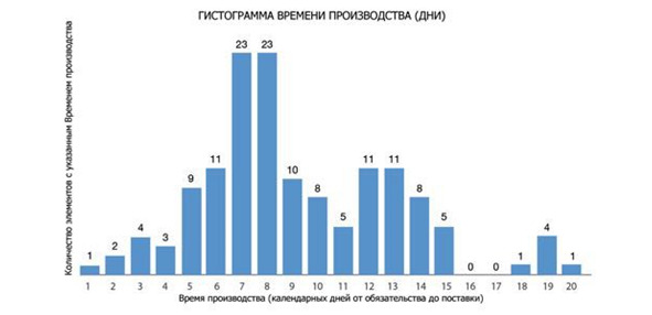 Другая полезная диаграмма – частотная диаграмма. По горизонтали откладываем срок выполнения задач в днях, по вертикали – число таких задач. Диаграмму строим в разрезе классов обслуживания, выделенных в SLA. Если задачи в потоке однородны, то мы получим пуассоново распределение или его аналог. А вот если у полученного распределения есть несколько максимумов, то значит мы имеем дело с существенно неоднородным потоком задач. В этом случае имеет смысл провести анализ, чтобы научиться заранее разделять классы задач и с этой помощью улучшить предсказуемость их выполнения и учесть это в SLA. Потому что предсказуемость для бизнеса часто имеет гораздо большее значение, чем скорость.