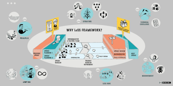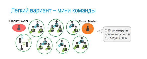Более сложный фреймворк – Large Scaled Scrum (LeSS) (русское описание) – несколько команд на одном продукте с общим Product Owner, BackLog, спринтами, планированием, демо и поставкой, это позволяет объединить до 8 команд. У фреймворка есть huge вариант, применяемый для больших компаний и рассчитанный на работу 1000+ человек.