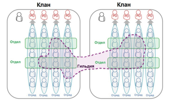Основной производственной единицей в ней является клан (tribe) в 100—200 человек, который работает над отдельным продуктом. Он представляет собой матрицу: делится на кроссфункциональные производственные отряды (squad) и функциональные отделы (chapter). Отряды реализуют новый функционал и состоят из специалистов разных специализаций, которые дополняют друг друга. А отделы координируют работы специалистов из разных команд, использующих общие технологии, решая такие задачи, как разработка мобильных интерфейсов в едином стиле, однородная работа серверной части или развитие технологий тестирования. Отметим, что отделы работают над применением технологий в рамках продукта, а вот для развития технологий в целом по компании существуют еще гильдии (guild) по интересам. По мере роста компании над кланами появились структуры следующего уровня – альянсы (alliance) и бизнес-единицы (business unit).
