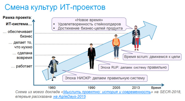 По мере того, как IT все больше входило в жизнь компаний и обеспечивало их бизнес-процессы, произошел следующий сдвиг рамки проекта: результатом проекта должно быть не просто разработка и внедрение софта, а решение в результате внедрения конкретных бизнес-задач и достижение возможностей бизнеса, при чем достижение результатов определяется не формальными критериями, а удовлетворенностью стейклолдеров. Принципиально изменился характер задач, которые бизнес ставит перед IT: не «разработать конкретный набор фич», а «доработать продукт так, чтобы доля занимаемого им рынка в Латинской Америке возросла с 3 до 7%», не «внедрить новую систему управления складом», а «добиться вместе с логистиками, чтобы пропускная способность склада в пиковую нагрузку увеличилась вдвое». И это по времени совпало с развитием интернет и ориентацией для продукты для конечного пользователя, а не для компаний, что вызвало свое семейство методов ведения проектов, основанных на User Experience. Которые, кстати, сейчас становятся актуальными и в других отраслях. Эта культура пока не имеет общего названия, потому что она не осознается как нечто цельное. Однако, составляющие ее концепты широко известны: UX, продуктовый подход, DevOps. Поэтому на слайде она просто обозначена как «Новое время».