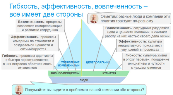 И тут уместно привести схему Марка Розина «Кораблик», наглядно показывающую разделение компании на бизнес-процессы и культуру, и два паруса, которые их двигают: целеполагание и управление изменениями. На рисунке поверх этой схемы показано отражение в этих составляющих таких ключевых факторов организации как гибкость, эффективность и вовлеченность.