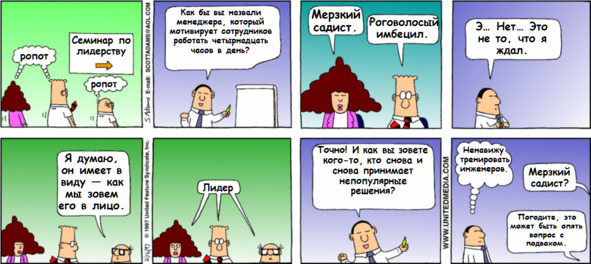 Деструктивные варианты культуры компаний, бессмысленный мир корпораций хорошо описаны в книге Дэйва Логана, Джона Кинга и Хэли Фишер-Райт «Лидер и племя». И там же описан выход в здоровую культуру через обретение смысла. Однако, сейчас этого уже недостаточно, потому что поколение соцсетей несет другие ценности и смыслы. И единственный образ правильной компании со здоровой культурой размывается, у него получается много трактовок. Возможно, когда вы выше читали, как я в этой статье определяю гибкость, эффективность и вовлеченность, то не согласились с тем смыслом, который я вложил в эти понятия. И это – совершенно нормально. На самом деле я знаю не один и не два, а более пяти вариантов наполнения этих понятий смыслами. И не только для этих понятий – изменяется взгляд на лидерство, справедливость, назначение и роль бизнеса и практически все остальное. Хорошая иллюстрация этих изменений – уже упоминавшиеся комиксы Скотта Адамса про Дильберта. Вот пример, как воспринимается лидерство. Заметим, что при этом люди прекрасно знают правильные слова, и если надо – то будут их говорить. Но вот как они при этом будут действовать – тоже понятно.