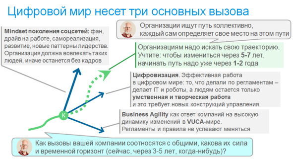 На данный момент можно заключить, что приход цифрового мира несет три основных вызова, которые обесценивают регулярный менеджмент, основанный на регламентах и компетентности сотрудников и требуют принципиально иных способов организации.